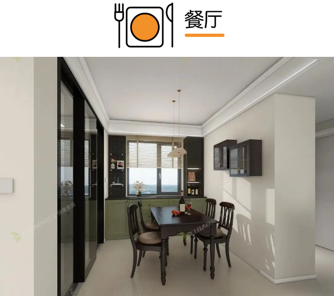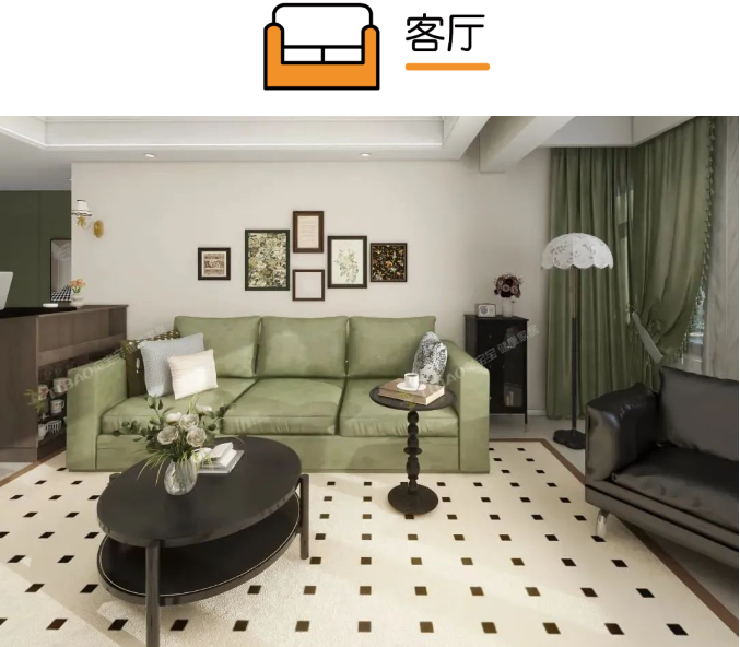 客廳整體以奶白色為主,走進(jìn)休閑區(qū),采用復(fù)古的墨綠色與原木色進(jìn)行撞色搭配,加強(qiáng)不同功能區(qū)的交互,墨綠、奶白、深咖在此交融,呈現(xiàn)出一個精致復(fù)古的溫馨空間。