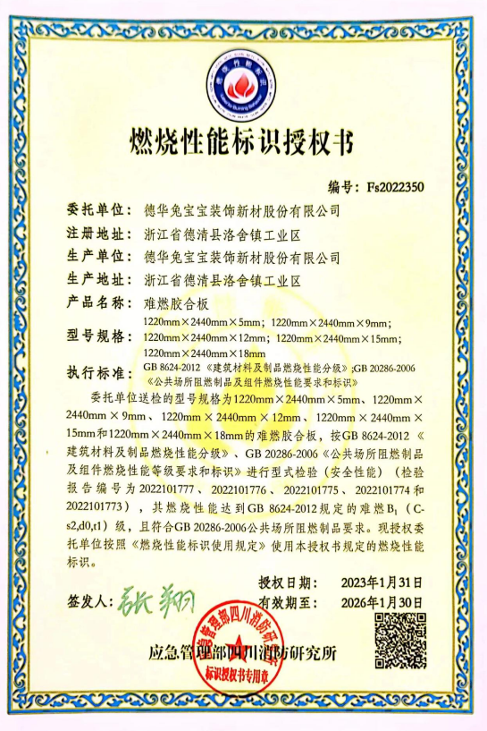 在眾多阻燃木材產(chǎn)品中,兔寶寶難燃板憑借其卓越的阻燃性能和環(huán)保特性,成為了市場上的佼佼者。兔寶寶難燃板創(chuàng)新性地結(jié)合了阻燃劑浸注與膠層隔斷工藝技術(shù),充分發(fā)揮了浸漬法阻燃功效穩(wěn)定及隔斷法不易吸濕的優(yōu)點(diǎn),使難燃膠合板在不同溫濕度環(huán)境下能持久保持良好的燃燒性能。而且其達(dá)到阻燃等級B1級的規(guī)范要求,600s總煙氣生成量低于國家標(biāo)準(zhǔn)≤200m2,煙氣毒性符合國標(biāo)GB-8624-2012t1級。這意味著在火災(zāi)發(fā)生時(shí)既能有效減緩火勢蔓延,還能有效抑制煙霧的產(chǎn)生,為消防和逃生爭取更多時(shí)間。兔寶寶難燃板不僅具有優(yōu)異的阻燃性能,還具有良好的環(huán)保性能,其甲醛釋放限量等級可達(dá)E0級,健康環(huán)保,滿足需求,家裝用可以絕對放心。