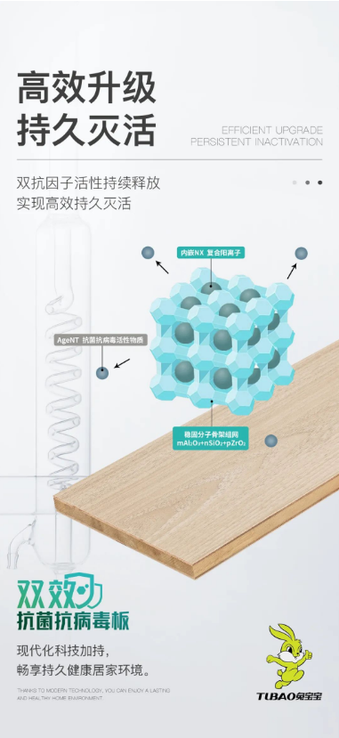 生活中的細(xì)菌、病毒,雖然微不可見,卻無處不在,它悄無聲息地飄散在家中的每一個角落——床頭、衣柜、櫥柜,時刻威脅著家人的健康。特別是在流感高發(fā)季,一旦有家庭成員不幸中招,病毒就可能通過空氣流動或日常接觸迅速擴散,威脅到其他家人的健康。而兔寶寶雙效抗菌抗病毒板材采用了先進的表層植入技術(shù),將雙效活性復(fù)合因子牢固地附著在板材表面,這些因子如同家中的隱形衛(wèi)士,24小時不間斷地守護著家的每一寸空間。