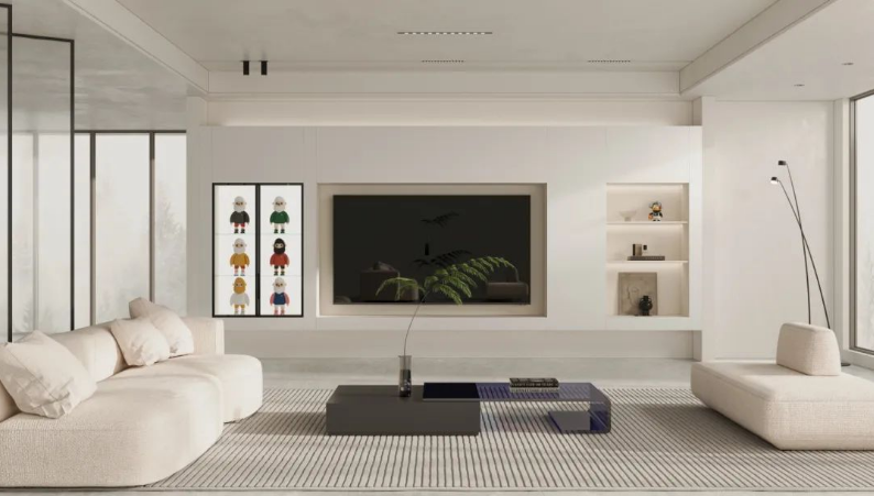 這種設(shè)計以電視為中心,向四周延伸,形成一整面墻的收納系統(tǒng),其收納能力令人嘆為觀止。開放式的展示架如同藝術(shù)品的展示窗,擺放著精美的擺件、書籍與旅行紀(jì)念品,彰顯主人的生活情趣與品味;而封閉式的柜門則像寶藏箱,將影音設(shè)備、雜物等一一隱藏,保持客廳的清爽與整潔。