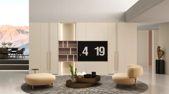 兔寶寶全屋定制黛茜系列,其電視柜設(shè)計(jì)獨(dú)具匠心,采用流暢的弧線與斜邊造型,不僅美觀大方,還能有效防止日??呐?。材質(zhì)方面,巧妙結(jié)合了金屬與玻璃的質(zhì)感,特別是金色與黑色金屬的搭配,形成了鮮明的色彩對(duì)比,為空間增添了強(qiáng)烈的視覺(jué)張力。在軟裝搭配上,該系列選用了風(fēng)格一致的圓弧型沙發(fā)與圓形茶幾,進(jìn)一步強(qiáng)化了整體的和諧美感,讓家的每一個(gè)角落都散發(fā)出低調(diào)而奢華的氣息。