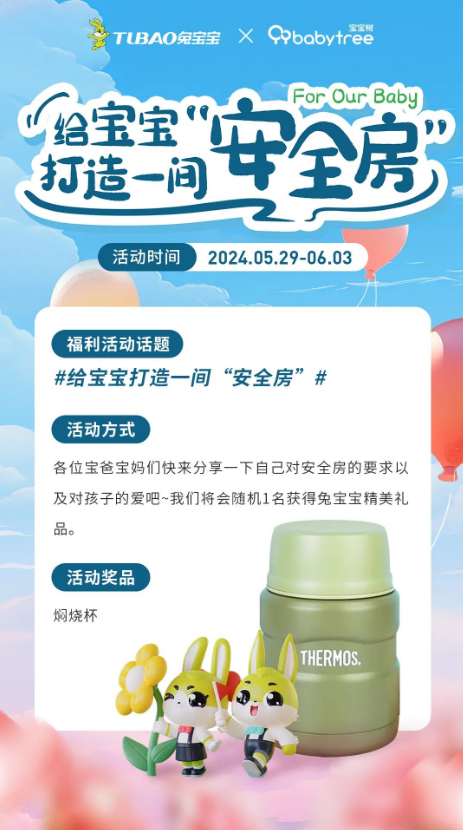 兒童是祖國(guó)的花朵,是家庭的希望。每一個(gè)孩子的健康成長(zhǎng),都牽動(dòng)著每一位家長(zhǎng)的心。在即將到來的“六一”兒童節(jié)之際,我們深感為孩子們提供一個(gè)安全、健康、快樂的成長(zhǎng)環(huán)境的重要性。因此,兔寶寶攜手寶寶樹,共同為孩子們打造一間“安全房”,守護(hù)他們的成長(zhǎng)環(huán)境。