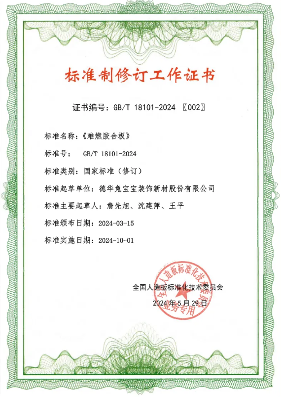 這源于是否真正遵循國(guó)家標(biāo)準(zhǔn) GB8624-2012《建筑材料及制品燃燒性能分級(jí)》,標(biāo)準(zhǔn)中難燃等級(jí)被嚴(yán)格分成了A、B1、B2和B3四個(gè)等級(jí),只有達(dá)到了B1級(jí)才能稱(chēng)為“難燃板”。B1級(jí)難燃材料需滿足多項(xiàng)嚴(yán)苛指標(biāo):燃燒增長(zhǎng)速率指數(shù)≤120W/s,600 秒內(nèi)總熱釋放量≤7.5MJ,且無(wú)燃燒滴落物引燃濾紙現(xiàn)象。為細(xì)化膠合板類(lèi)產(chǎn)品的阻燃技術(shù)要求,GB/T 18101-2024《難燃膠合板》于2024年10月正式實(shí)施,規(guī)范了難燃膠合板的使用材料、處理方法、技術(shù)措施,以及企業(yè)生產(chǎn)控制的實(shí)驗(yàn)方法等。作為家居建材行業(yè)的佼佼者,兔寶寶憑借多年的技術(shù)積累,創(chuàng)新“阻燃劑浸注+膠層隔斷”雙重工藝,在低煙毒釋放、穩(wěn)定阻燃等關(guān)鍵技術(shù)領(lǐng)域取得突破,并作為主要起草單位參與GB/T 18101-2024《難燃膠合板》標(biāo)準(zhǔn)的制定,其研究成果為標(biāo)準(zhǔn)的科學(xué)性和可操作性提供了實(shí)踐支撐。