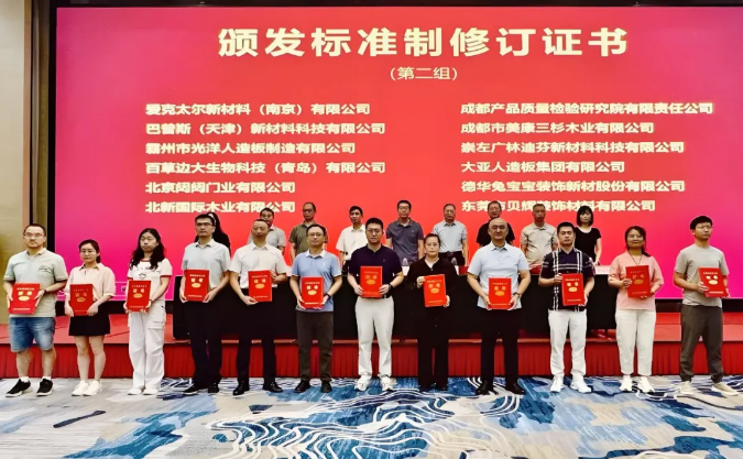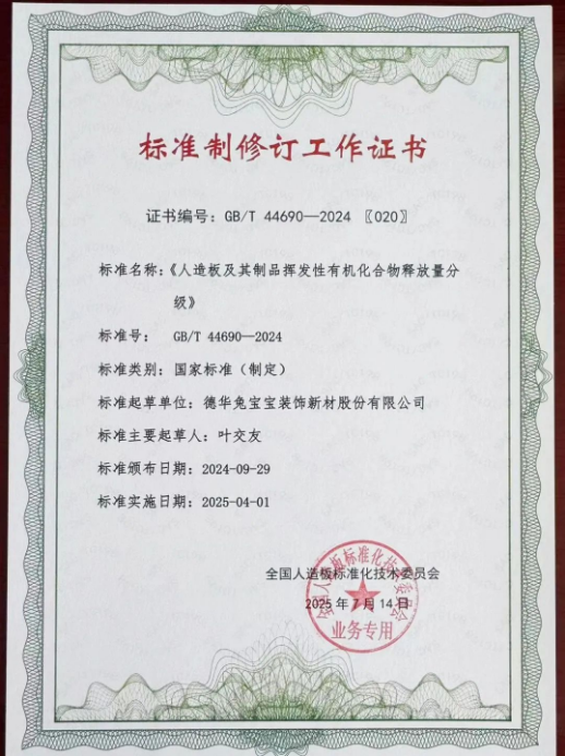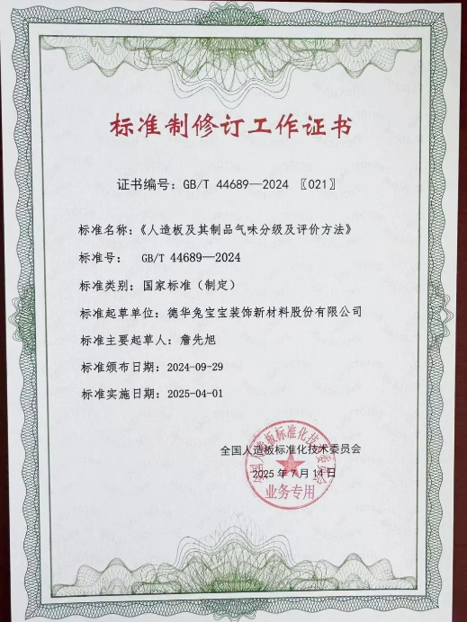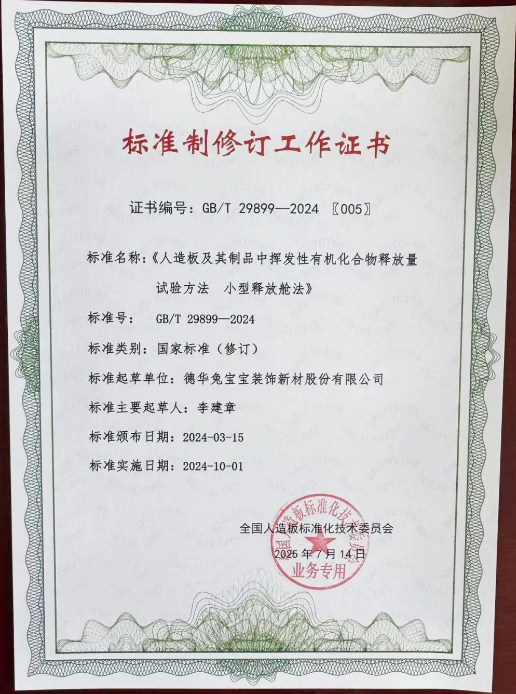 7月14日,德華兔寶寶裝飾新材股份有限公司憑借深厚的技術(shù)積累與行業(yè)引領(lǐng)力,成功參與四項(xiàng)國(guó)家標(biāo)準(zhǔn)的制定,并獲得參標(biāo)證書,彰顯公司在裝飾板材領(lǐng)域的標(biāo)桿地位。這四項(xiàng)標(biāo)準(zhǔn)分別是GB 18580-2025《室內(nèi)裝飾裝修材料 人造板及其制品中甲醛釋放限量》、GB/T 29899-2024《人造板及其制品中揮發(fā)性有機(jī)化合物釋放量試驗(yàn)方法—小型釋放艙法》、GB/T 44689-2024《人造板及其制品氣味分級(jí)及評(píng)價(jià)方法》和 GB/T 44690-2024《人造板及其制品揮發(fā)性有機(jī)化合物釋放量分級(jí)》。