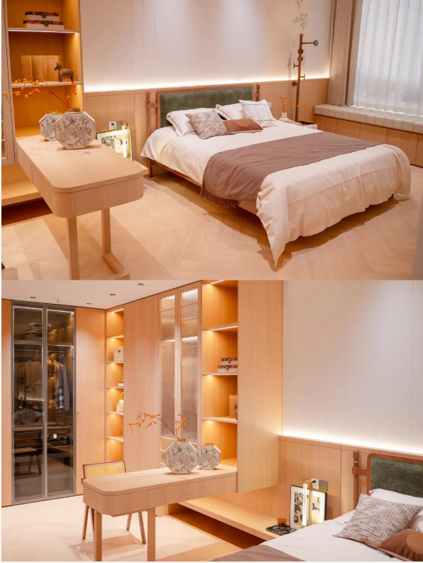 不同于傳統(tǒng)家居店單一的板材陳列與柜類展示,兔寶寶武林之星1號(hào)店以 “生活場(chǎng)景”為核心,打造了1:1實(shí)景樣板間矩陣。從100㎡剛需戶型、130㎡改善空間,到寬敞的大平層、高端別墅場(chǎng)景,多維居住空間全覆蓋,真實(shí)還原從毛坯到精裝的全流程。小到一塊板材的紋理、一個(gè)五金件的質(zhì)感,大到整體空間的軟裝搭配、色彩協(xié)調(diào),每一處細(xì)節(jié)都清晰可見。消費(fèi)者走進(jìn)樣板間,就能直觀觸摸未來家的質(zhì)感,真正實(shí)現(xiàn)“所見即所得”的定制體驗(yàn)。