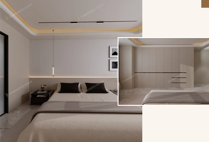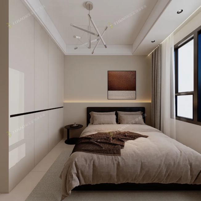 主臥延續(xù)了現(xiàn)代簡(jiǎn)約的風(fēng)格,用簡(jiǎn)潔的線條和實(shí)用的布局,褪去了繁雜裝飾,回歸生活的本質(zhì)。從床尾的定制衣柜到床頭的多功能床頭柜,每一處設(shè)計(jì)都兼顧了美觀與功能。定制衣柜貼合墻面,充分利用了垂直空間,收納能力超強(qiáng),能輕松裝下夫妻二人的衣物;多功能床頭柜不僅能放置睡前讀物、手機(jī),還帶有隱藏收納格,小物件也能妥善安放。