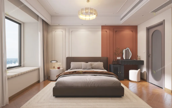 主臥整體設(shè)計簡約又不失格調(diào),一側(cè)的飄窗,讓自然光肆意涌入,既拓展了空間視覺感,又提供了一處可賞景、放松的小角落。床旁的白色圓形邊幾,搭配簡約燈具,方便實用。另一側(cè)的梳妝臺,深色柜體與墻面的暖橘色調(diào)相襯,精致的鏡子和小巧的擺件,盡顯生活的精致感。