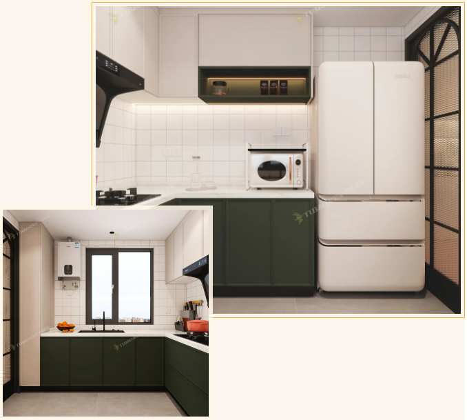 墨綠的櫥柜帶著低調(diào)的質(zhì)感,不張揚卻足夠吸睛,各類家電被巧妙嵌入其中,讓空間顯得整潔而有序。墻面鋪設(shè)的大理石,自然流暢地延伸開來,不僅為廚房增添了幾分精致感,更在視覺上拓寬了空間的廣度,消解了小空間的局促。L型的流暢動線,將洗菜、切菜、烹飪等區(qū)域合理劃分,操作起來得心應手,讓原本單調(diào)的烹飪勞作,不再是枯燥的任務,而是變成了融入日常、能傳遞溫情的生活片段。