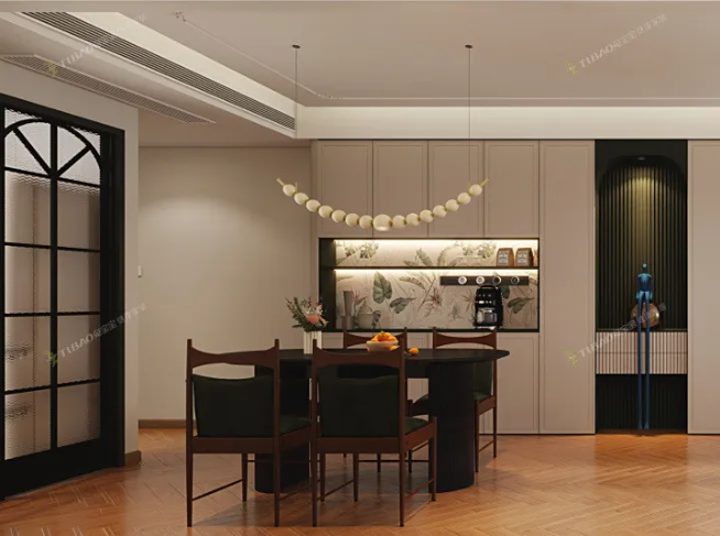 一旁的餐邊柜亦是點睛之筆,中間的開放格設(shè)計恰到好處,既能擺放精致的餐具、綠植,又不會顯得壓抑,為空間增添了幾分層次感;白色柜門干凈利落,再加上柜體上簡潔流暢的線條,沒有多余的裝飾,卻與整體空間的簡雅風格完美契合,既滿足了收納需求,又讓餐廳的景致更顯完整協(xié)調(diào)。