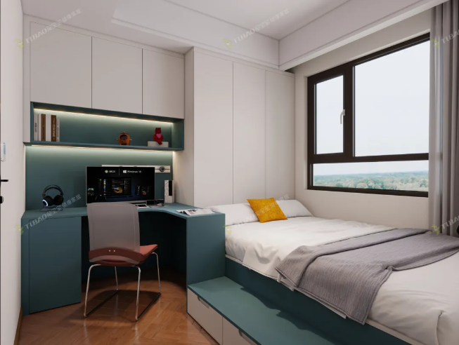 次臥以明亮色彩為主,定制的榻榻米床實用又美觀,書桌與書架一體化設(shè)計,既滿足了學習需求,又讓空間利用更高效,整體營造出活潑又有序的氛圍,很適合用作學習和休息的小天地。
