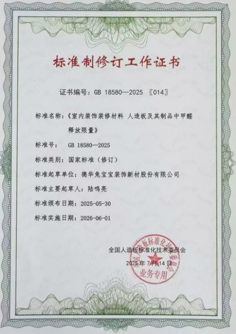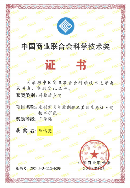 陸鳴亮作為主要起草人之一,參與16項國家、行業(yè)和公司標準的制定工作,涵蓋產(chǎn)品質量、安全環(huán)保、技術規(guī)范等方面。其中,兔寶寶實木地板和實木復合地板標準,入選 2024年企業(yè)標準“領跑者”名單;“定制家具智能制造及其用生態(tài)板關鍵技術研究”獲2024年度中國商業(yè)聯(lián)合會科學技術獎三等獎。