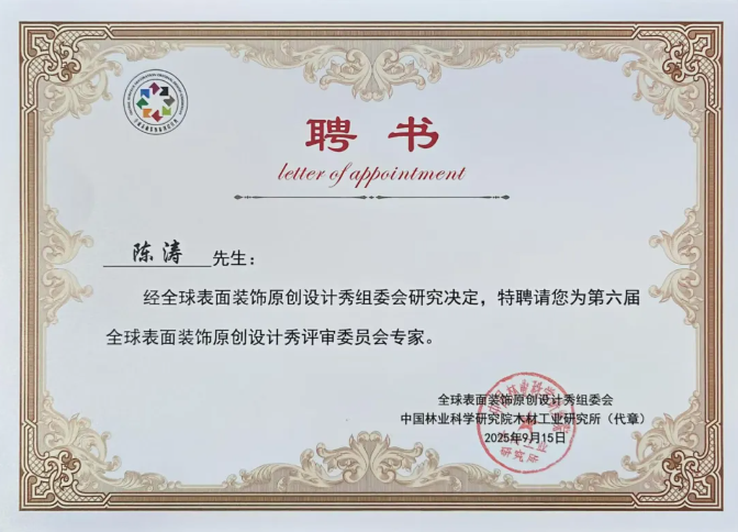 與此同時,公司花色開發(fā)部經(jīng)理陳濤憑借深厚的行業(yè)積淀與專業(yè)能力,受邀特聘為“第六屆全球表面裝飾原創(chuàng)設(shè)計秀”評審委員會專家。該設(shè)計秀作為匯聚行業(yè)原創(chuàng)力量的核心活動,組建了由18位產(chǎn)業(yè)鏈資深人士構(gòu)成的“作品入圍專家評審團”,通過專業(yè)嚴謹?shù)拇蚍謾C制,從眾多參賽作品中遴選出入圍作品100款,成為大會期間的關(guān)注焦點。