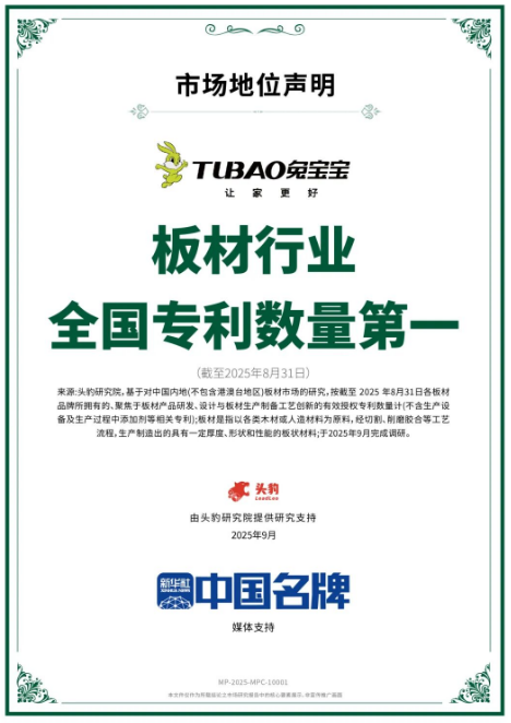 多年來,兔寶寶憑借在木業(yè)領(lǐng)域深厚的技術(shù)積累和卓越的創(chuàng)新能力,積極參與國際、國家和行業(yè)標(biāo)準(zhǔn)的制定工作,成為行業(yè)標(biāo)準(zhǔn)的重要推動者和引領(lǐng)者。截至目前,兔寶寶已參與制定ISO國際標(biāo)準(zhǔn)12項,參與定制國家標(biāo)準(zhǔn)138項,參與定制行業(yè)標(biāo)準(zhǔn)114項,并申請674項專利,穩(wěn)居行業(yè)專利數(shù)量首位。這些數(shù)字既是兔寶寶科研實力的有力證明,更是引領(lǐng)行業(yè)發(fā)展的堅實支撐。