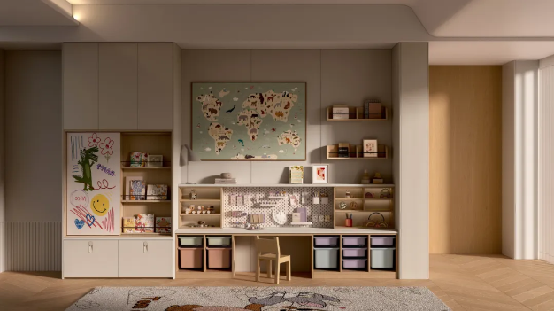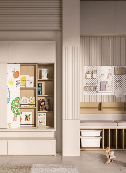 專為激發(fā)孩子想象力與創(chuàng)造力而設計,整合了涂鴉區(qū)、讀物區(qū)與玩具收納區(qū)。通過上翻書架、抽拉收納籃、洞洞板墻面及定制靠背收納等多重方式,巧妙解決育兒家庭玩具、書籍雜亂無章的痛點,讓一切物品井然有序,讓孩子在游戲中學習,在探索中成長。