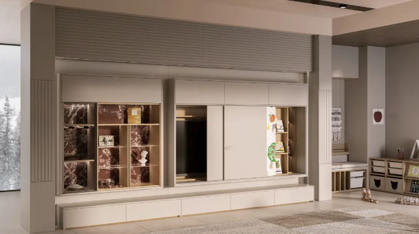 客廳設計徹底告別傳統(tǒng)布局,轉(zhuǎn)而以“育兒”需求為核心。采用去客廳化設計,優(yōu)化孩子活動動線。最引人注目的是DIY涂鴉移門,采用骨骼線包邊內(nèi)嵌金屬琺瑯板,表面光滑易清潔,讓孩子能夠自由圖畫、輕松擦除,在安全無憂中激發(fā)創(chuàng)造力,實現(xiàn)育兒“功能化”與“個性化”的融合。