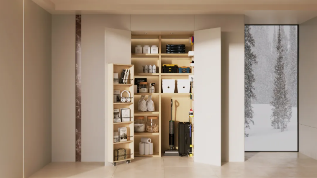 創(chuàng)新融入“800庫”收納理念,倡導物盡其用、定期清理,建立高效簡潔的生活秩序。此設計能完美收納玩具、行李箱、洗地機、嬰兒車等大件物品,解決育兒用戶物品繁多、存取不便的核心痛點。輪滑柜門設計巧妙節(jié)省空間,提升收納效率;定制掛墻金屬洞洞板充分利用垂直空間,提供多樣掛件,靈活滿足不同需求,讓雜亂日常重歸井然有序。