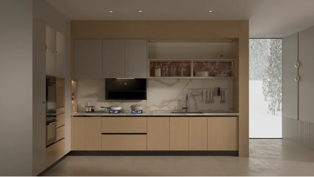該廚房系列采用地柜、吊柜結(jié)合立柜的方式,充分擴大廚房的儲物功能。L型櫥柜靈活應對多種空間形態(tài),并在開放空間中起到一定的圍和作用。經(jīng)典配色,低調(diào)耐看,肌理質(zhì)感搭配木質(zhì)紋理,豐富有質(zhì)感。產(chǎn)品植入大量的五金和功能性配件,增加收納功能的多樣化。