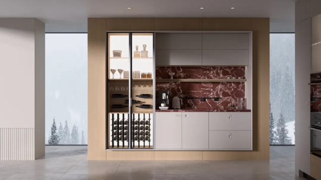 酒柜運用了進退+圍合的設計看起來也非常有高級感。大膽搭配紅色石紋雙飾面跳色超吸睛,再加上玻璃拉絲材質(zhì)和燈帶,氛圍感直接拉滿。擺脫了傳統(tǒng)層板樣式的收納功能,加入整體性的,模塊化的,功能性的收納形式,可以根據(jù)不同需求和空間尺寸進行靈活組合,選擇不同大小的柜體、抽屜和隔板,滿足不同物品的存放需求,實現(xiàn)個性化的收納和展示空間。