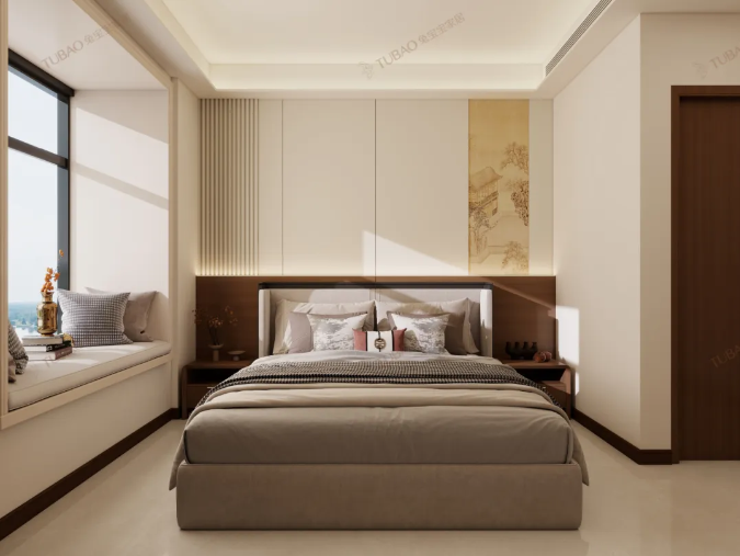 主臥,是設計理念中“少即是多”的極致體現(xiàn)。墻上沒有過多的裝飾,僅通過大面積的“留白”、內嵌的意境國畫與精心設計的燈光,便勾勒出一個簡潔雅致、古樸溫馨的休憩場景。床側一排到頂的衣柜,充分利用垂直空間,極大地增加了收納容量,將現(xiàn)代生活的實用性巧妙隱于簡約意境之后。