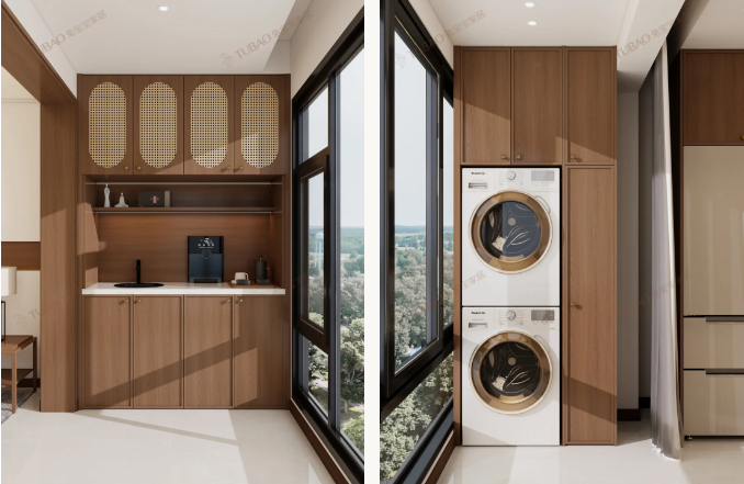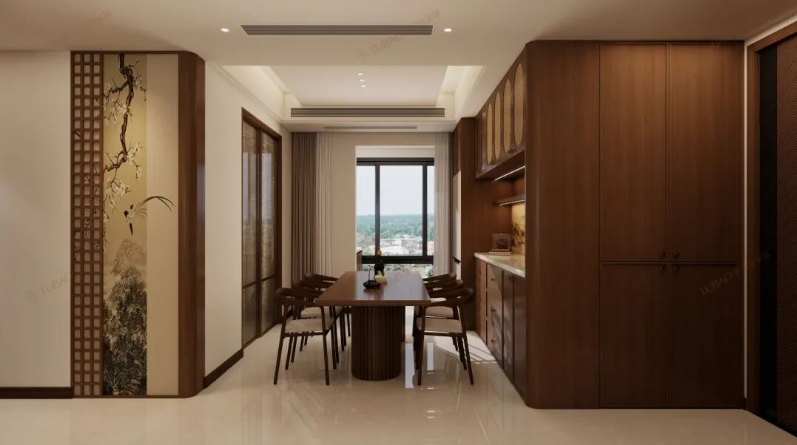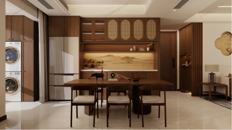餐廳延續(xù)了這份低飽和度的溫潤木色。陶器、竹子等天然材質的巧妙運用,完美詮釋了宋代“寧拙毋巧”的審美哲學,無需刻意雕琢,古雅靜秀的氛圍便油然而生。到頂的餐邊柜提供了充足的收納空間,部分柜門采用藤編材質,天然的紋理與獨特的透氣性,不僅與宋氏美學追求的自然與簡約理念完美契合,更讓收納本身成為一種裝飾。餐具、廚具與食材均可整潔有序地歸置于此,而開放的擱板則方便取用常用物品。