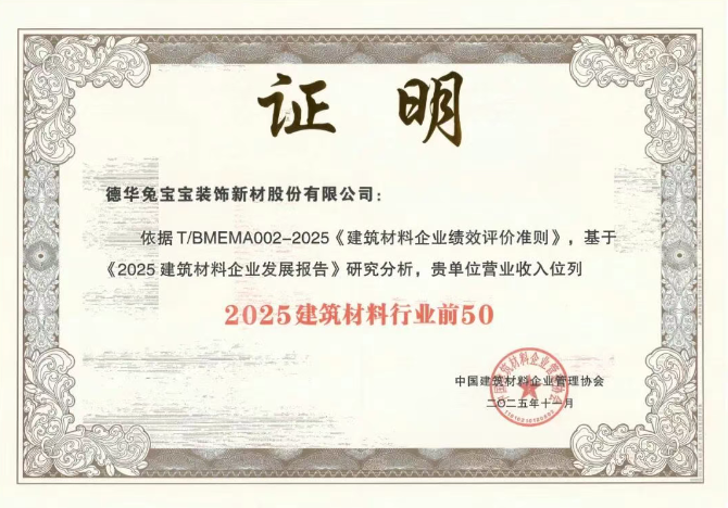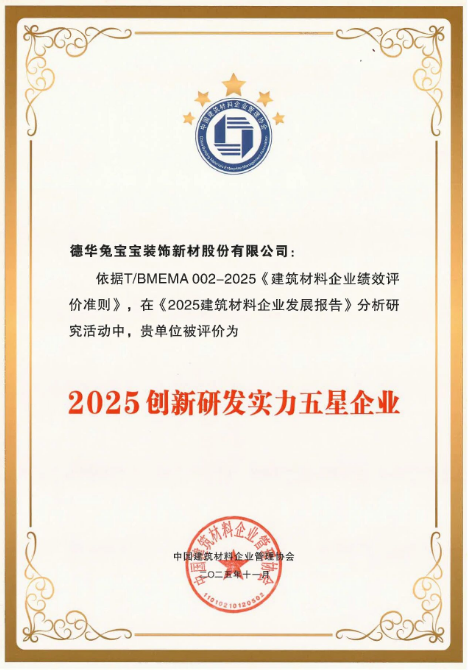 近日,中國(guó)建筑材料企業(yè)管理協(xié)會(huì)正式發(fā)布《2025建筑材料企業(yè)發(fā)展報(bào)告》。兔寶寶憑借卓越的綜合實(shí)力與持續(xù)的技術(shù)創(chuàng)新,一舉斬獲“2025創(chuàng)新研發(fā)實(shí)力五星企業(yè)”與“2025建筑材料行業(yè)前50”兩項(xiàng)重磅榮譽(yù)。這不僅是對(duì)兔寶寶實(shí)力的高度認(rèn)可,更是行業(yè)對(duì)技術(shù)突破的權(quán)威見證。