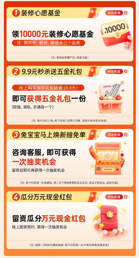 活動期間,咨詢客服即可獲得一次“馬上煥新抽免單”機(jī)會。幸運(yùn)之神或許就在此刻眷顧,讓您的新家夢想,擁有一份意想不到的驚喜。