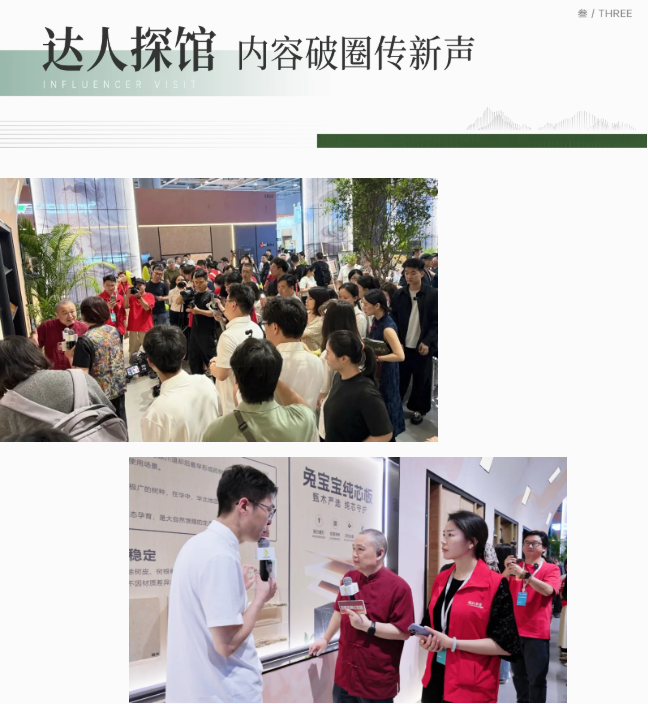 兔寶寶達(dá)人媒體探館活動(dòng)精彩開(kāi)啟,為品牌聲量再添熱度。新華社、新華網(wǎng)、央廣網(wǎng)、環(huán)球網(wǎng)、中國(guó)質(zhì)量新聞網(wǎng)等權(quán)威媒體,以及“旦哥說(shuō)定制”“王誠(chéng)講定制”“泛家居”“定峰匯”“輕高定有基會(huì)”等幾十名行業(yè)頭部達(dá)人沉浸式探訪展館,以多元視角捕捉東方匠心與現(xiàn)代高定的交融瞬間,從專業(yè)產(chǎn)品解讀到生活化場(chǎng)景表達(dá),多平臺(tái)優(yōu)質(zhì)內(nèi)容同步釋放,實(shí)現(xiàn)線上線下深度共振。