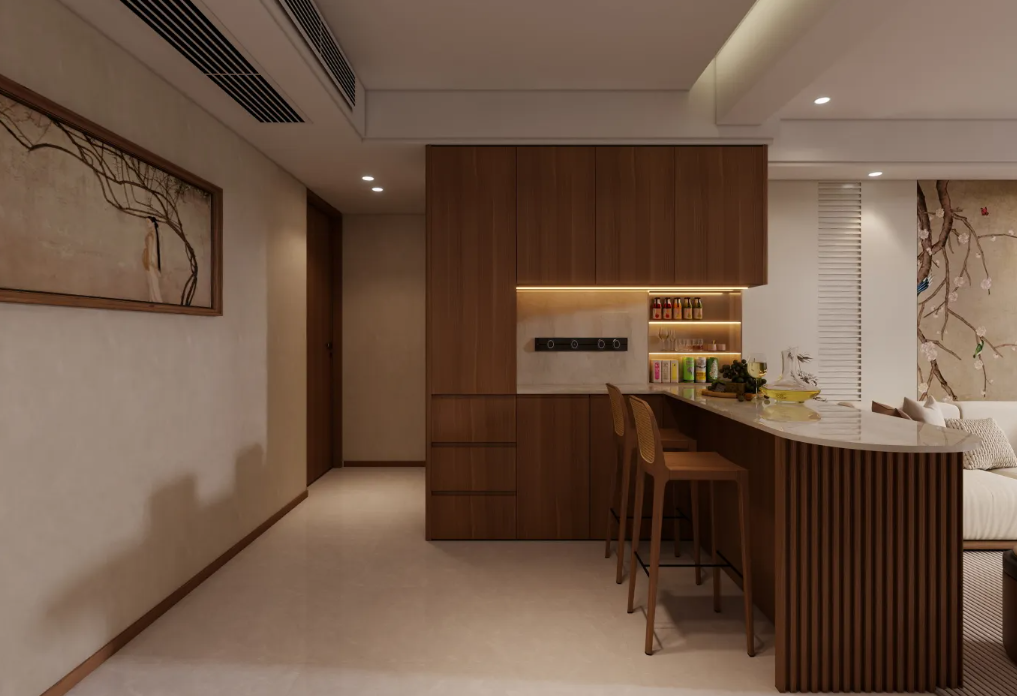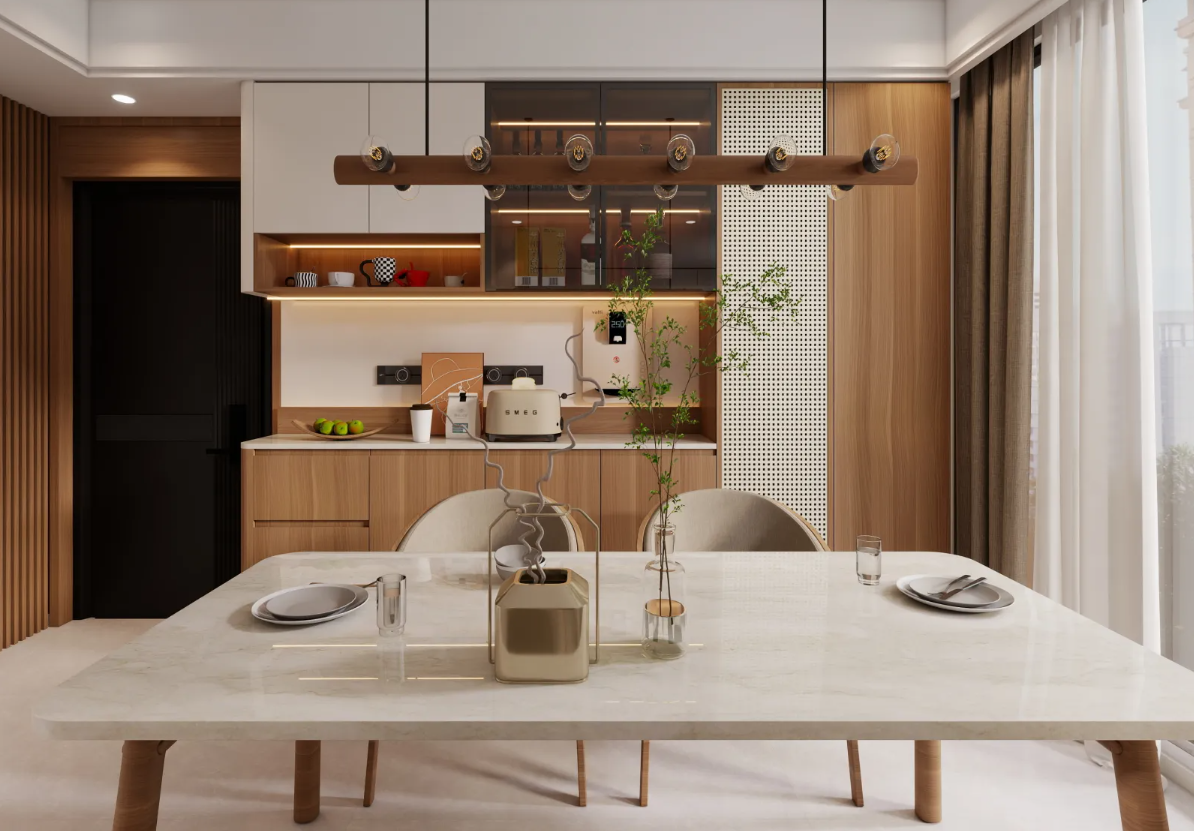 木材+石材:木的溫潤與石的冷冽形成對比,常用于背景墻、島臺設(shè)計。