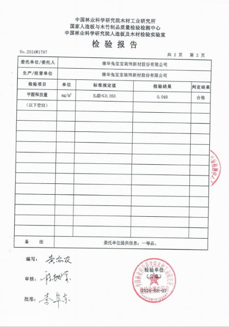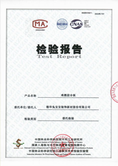 為了證實兔寶寶難燃膠合板的環(huán)保性能同樣優(yōu)秀最直接和真實的方式是通過公開抽樣送樣的方式,并對檢測結果進行公示。此次檢測是根據(jù)GB/T 39600-2021《甲醛釋放量》標準要求,對兔寶寶難燃膠合板的甲醛釋放量進行檢測,其檢測結果為0.049mg/m3,符合環(huán)保等級E0級。