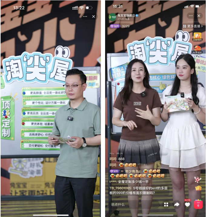 618當(dāng)天,兔寶寶以天貓旗艦店與官方抖音為主陣地進(jìn)行直播。天貓兔寶寶旗艦店直播聚焦于家居健康、產(chǎn)品功能及生活品質(zhì),邀請到了兔寶寶全屋定制專家,為消費(fèi)者詳細(xì)介紹兔寶寶全屋定制的品牌優(yōu)勢和案例分享,手把手教學(xué)幫大家省錢省心享受生活。此外我們邀請參與到本次“爆改計(jì)劃”的業(yè)主朋友,分享自己的空間改造經(jīng)驗(yàn),以及選擇兔寶寶的真實(shí)用戶體驗(yàn)。