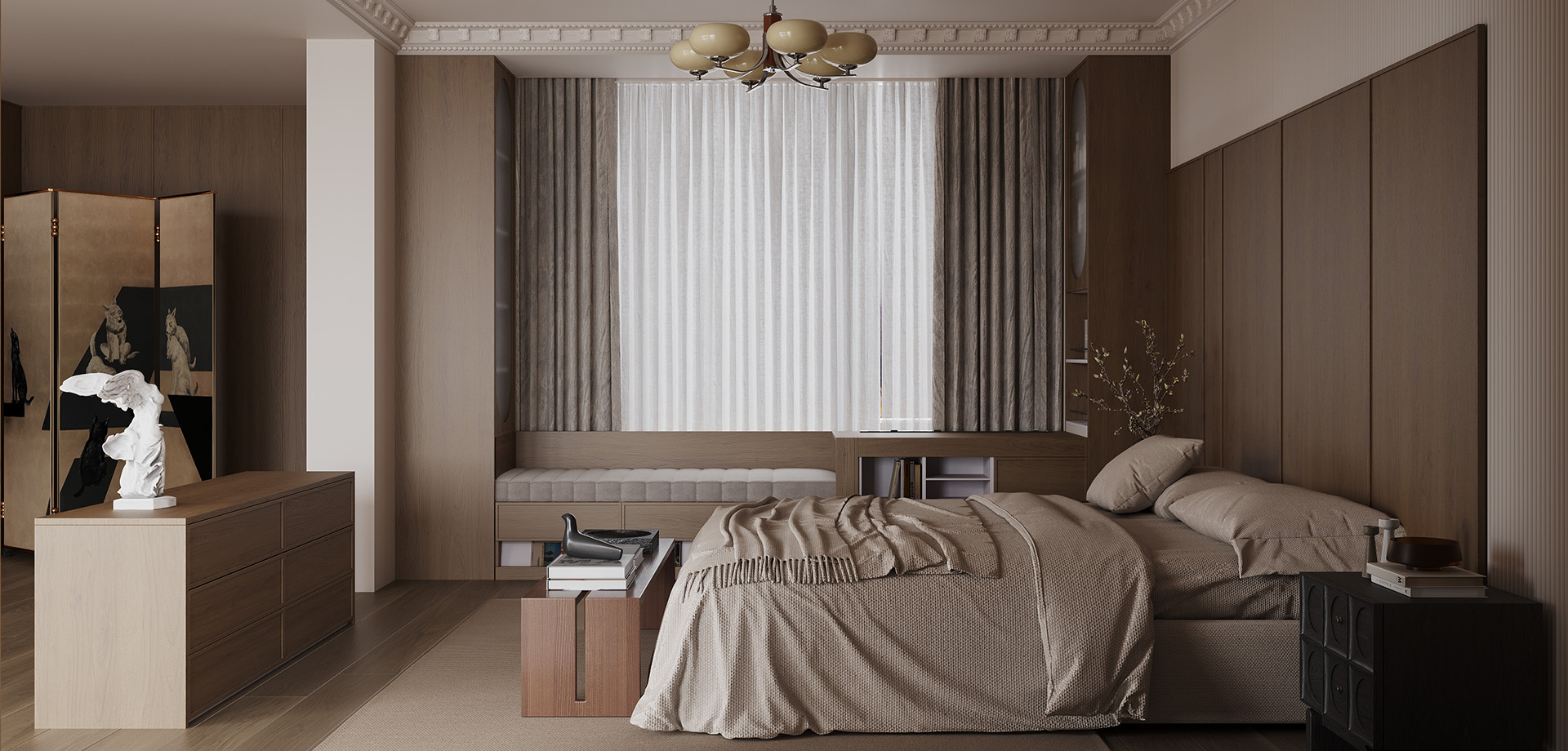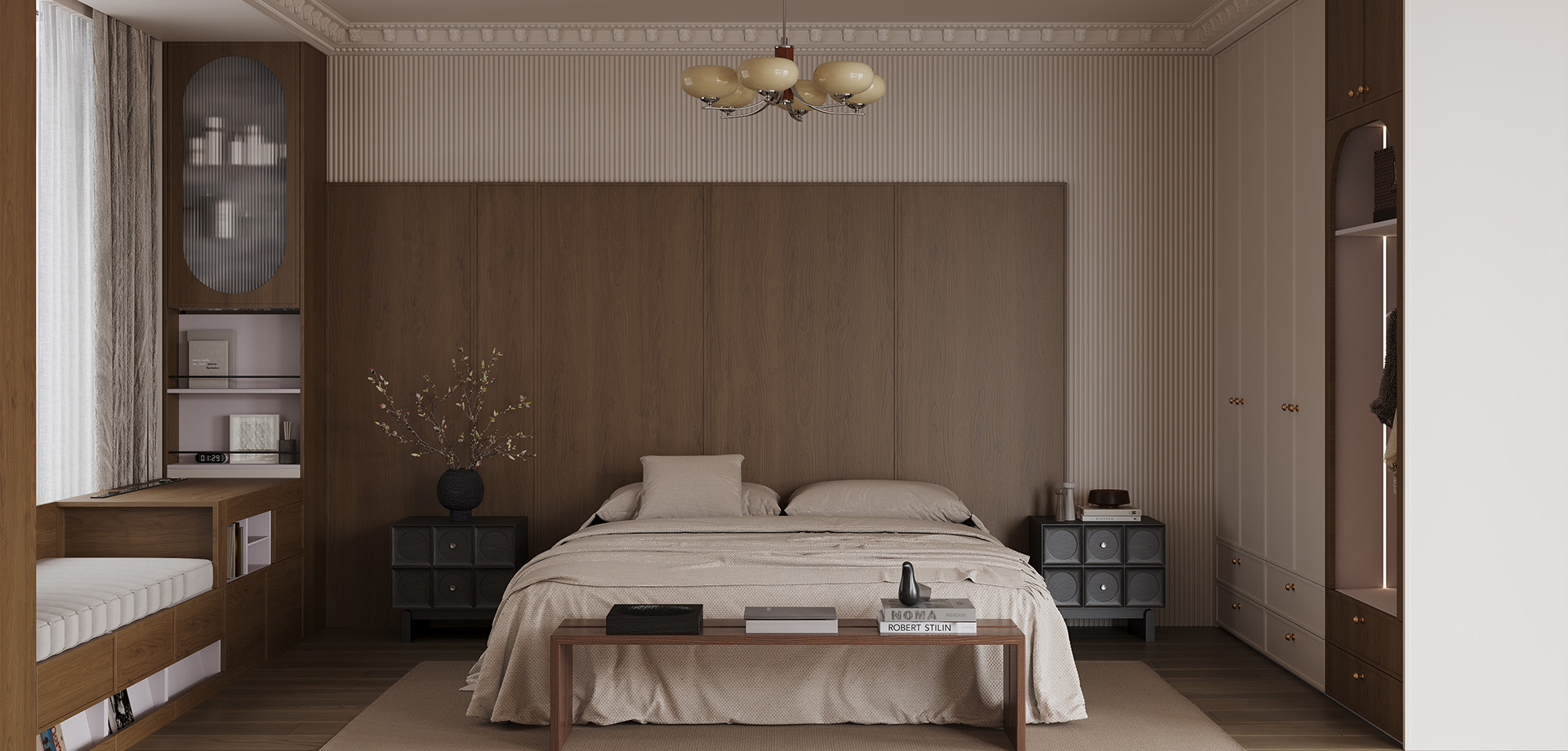 床靠背景胡桃木骨骼線護(hù)墻板配小格柵板錯(cuò)層設(shè)計(jì),層次感豐富,不顯單調(diào)。