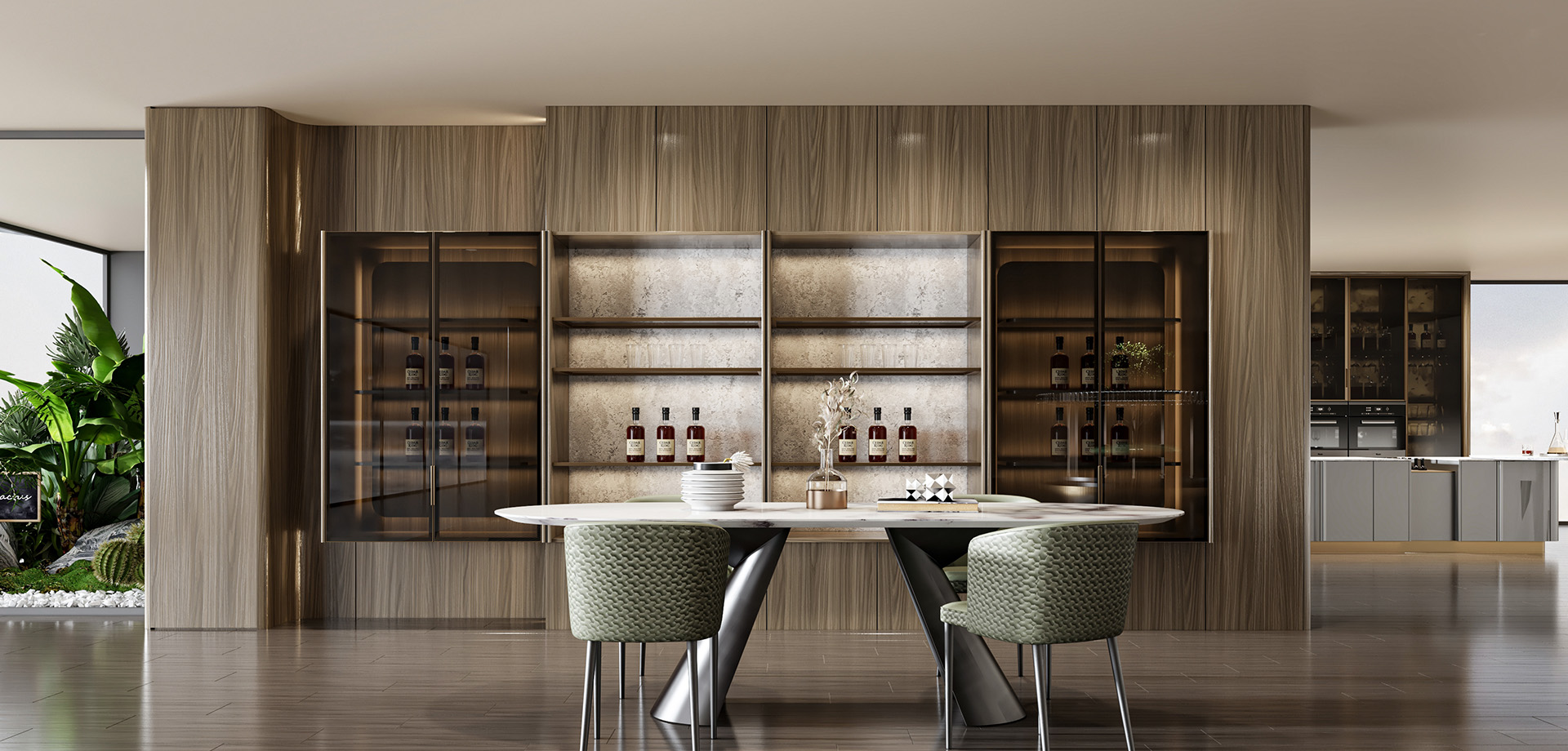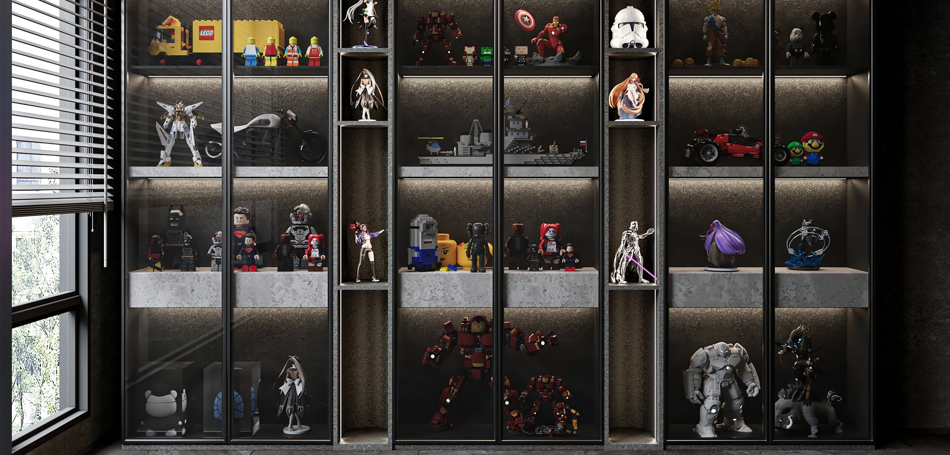 封閉儲(chǔ)物+玻璃燈帶展示格分區(qū)