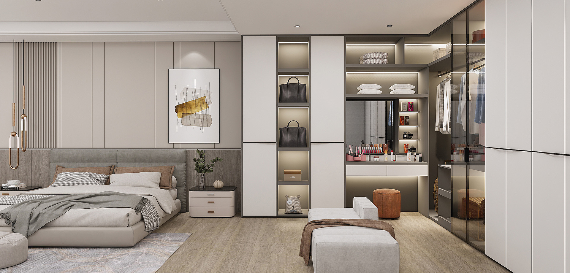 衣帽間設(shè)計(jì)功能空間齊備,不存在基礎(chǔ)的布局的缺失,體現(xiàn)空間的通透感。
