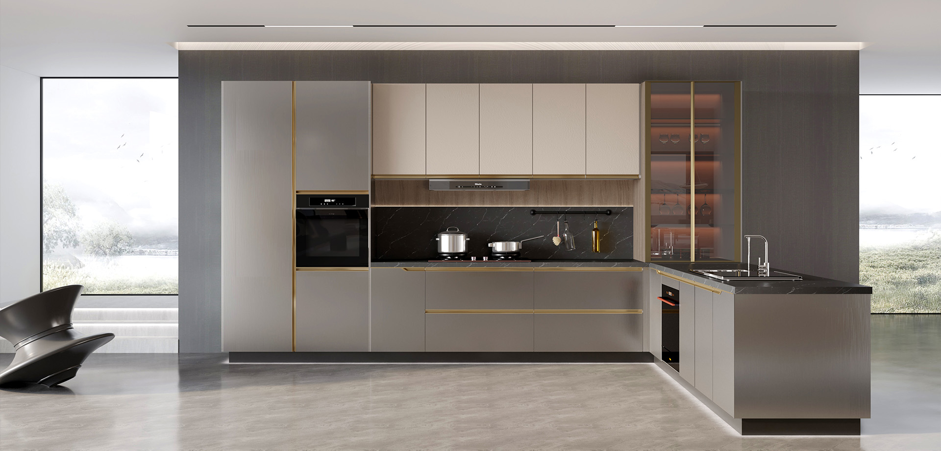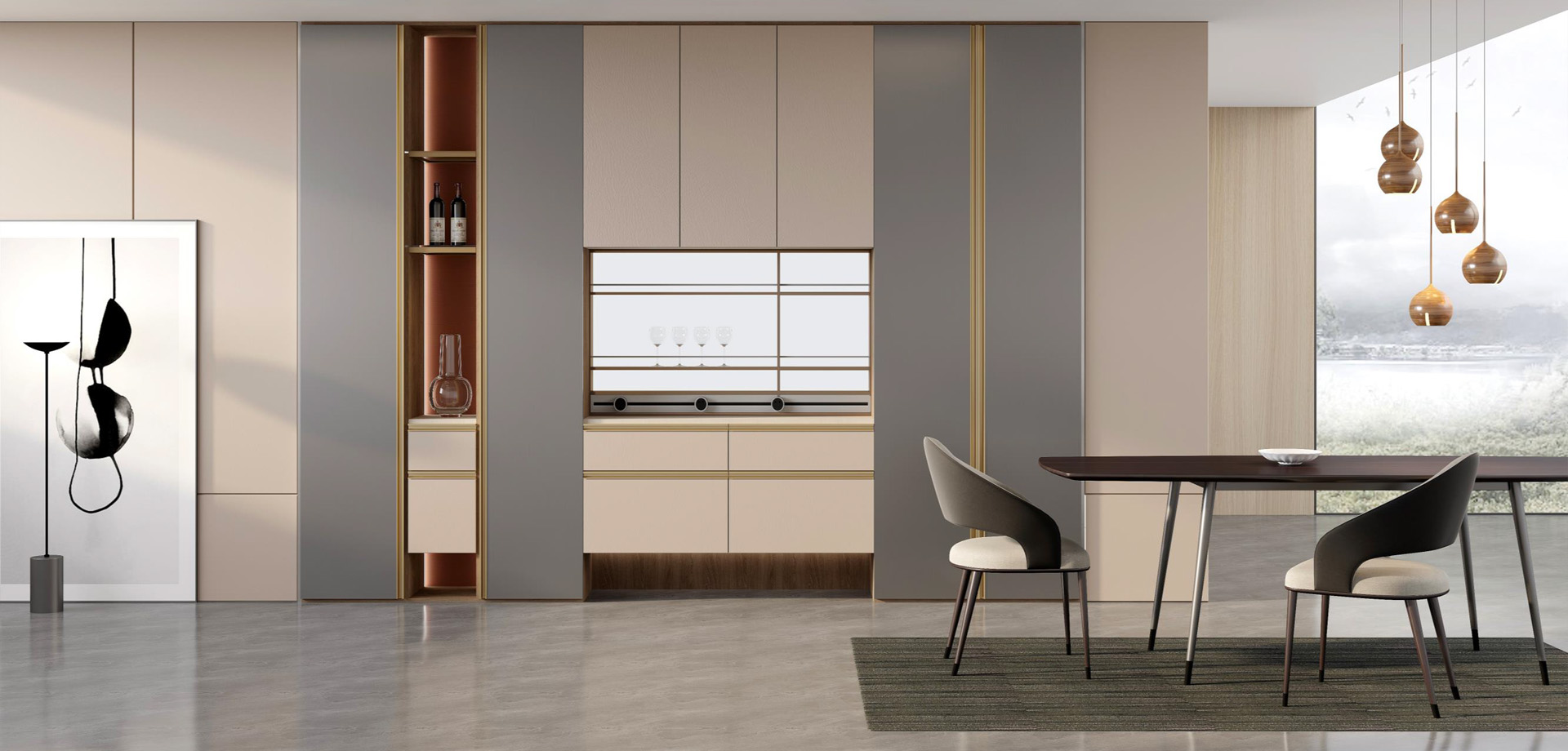金屬拉絲PET門板,搭配啞金色通體拉手,背板采用天然肌理紋設(shè)計。