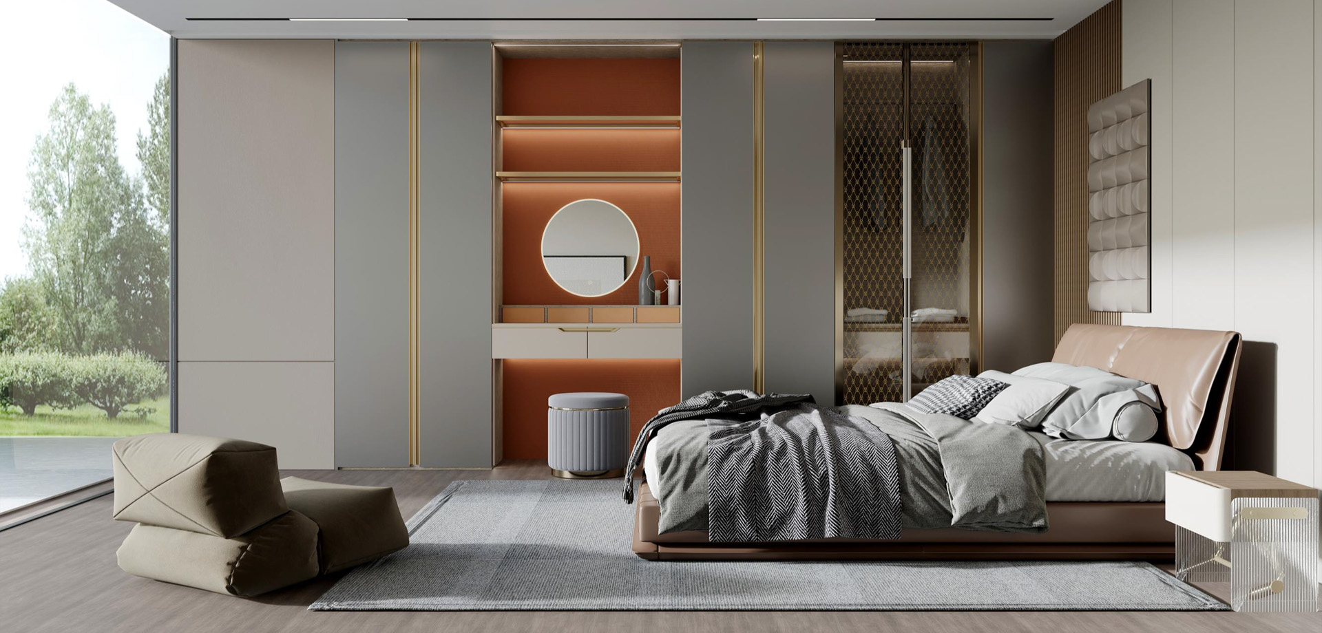 衣柜結(jié)合了收納、展示、梳妝功能為一體的設(shè)計,