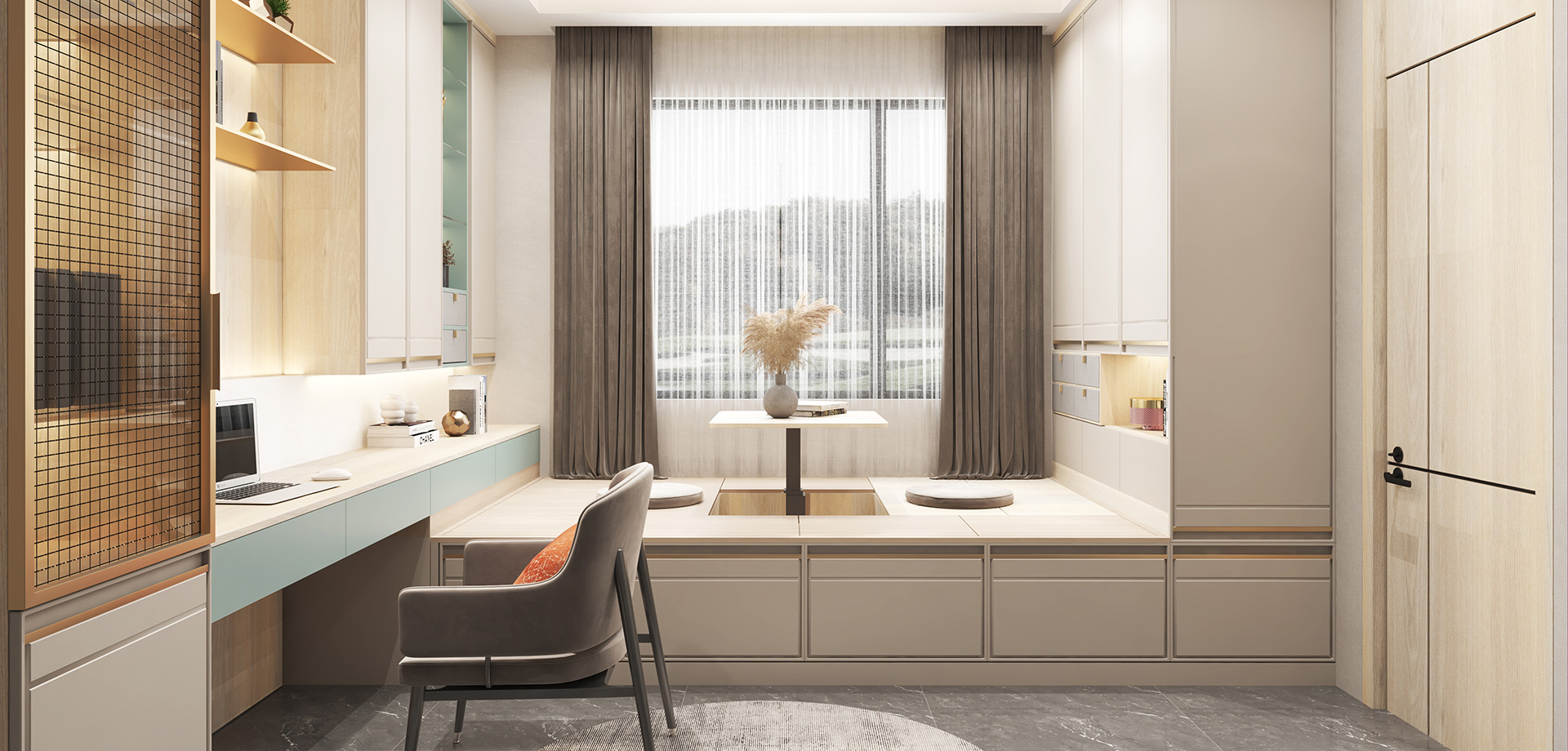 背墻收納系統(tǒng)和電力軌道插座的加入讓其功能更加齊全。