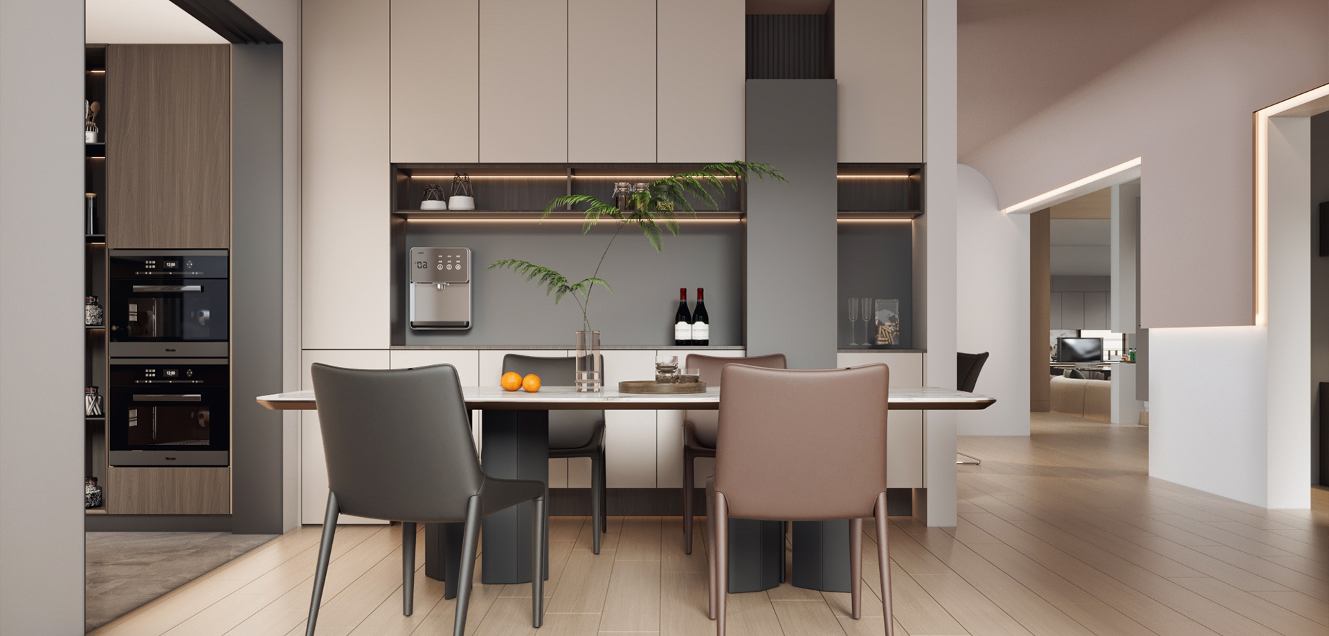 從門到墻,再到柜的一體化空間解決方案,使得整體風(fēng)格協(xié)調(diào)統(tǒng)一,創(chuàng)造一種簡約而不失高雅藝術(shù)居家空間。